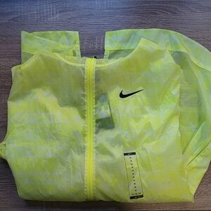 Bright yellow Nike hooded jacket with logo. Stylish and lightweight.