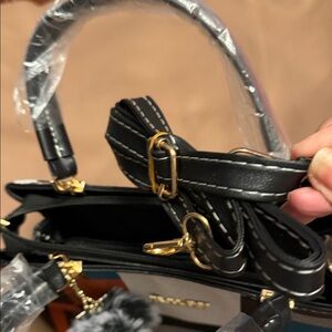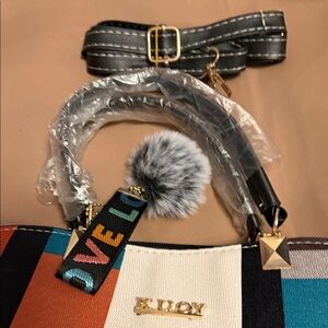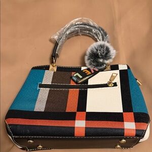 Multicolor Geometric Satchel with Pom Pom. Elevate your style with this chic multicolor satchel. Featuring a playful pom pom and a striking geometric design, it's perfect for any occasion.