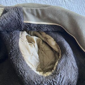 Outer shell is a durable brown wool, interior is fully lined with thick brown sherpa/faux shearling for excellent warmth. Two large front pockets and button front closure. Back vent for ease of movement.