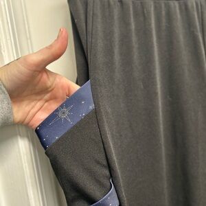 These Women's Black and Celestial Print Flare Leg Pants in size 1X are perfect for a casual or travel outfit. Measurements provided, these run a bit small. Made of polyester knit fabric, these pants feature a pull-on closure and a flattering flared leg style. The celestial inserts add a touch of space-inspired theme, making them a fun and comfortable choice for various occasions. Machine washable and with easy care features, these pants are a stylish and versatile addition to any wardrobe.