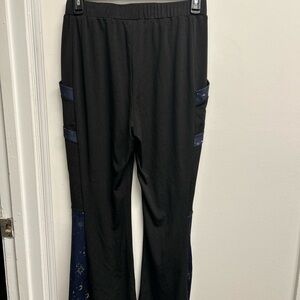 Stylish black pants with blue starry patterned accents. Perfect for a unique look.