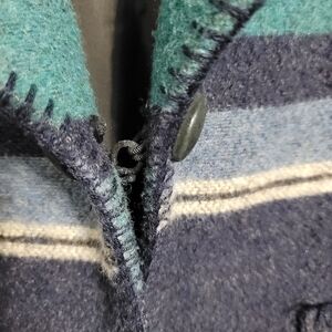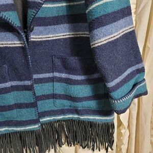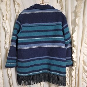 Mid-West Garment Co. Saddle Blanket Fringe Coat. Southwest Western coat. Foldover lapel. Patch pockets on front. Leather fringe hem. Fully lined. Absolutely beautiful coat! Wool Blend to keep you warm but still stay fashionable. Shades of blue. Great condition, no stains or holes.