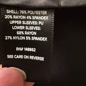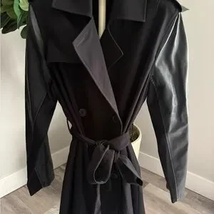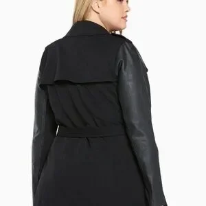 Chic black trench coat with double-breasted design. Features sleek faux leather sleeves. Perfect for a stylish look.