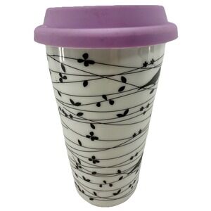 Ciroa Oiseau Coffee Travel Mug W/Lid Bird on a Vine Black and White Unused New