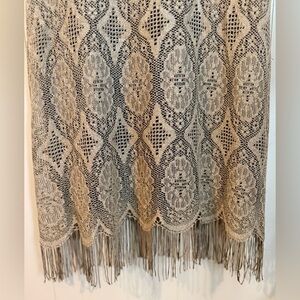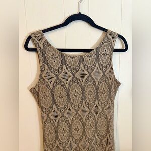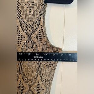 This vintage HARLOW dress is perfect for any formal or party occasion. The beautiful tan lace detailing over the black bodice creates a stunning pencil dress that will make you stand out in any crowd. The knee-length dress features a pullover closure and is a size 10, making it a great fit for most women.