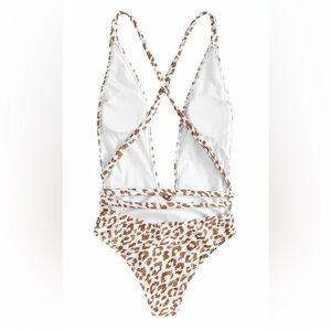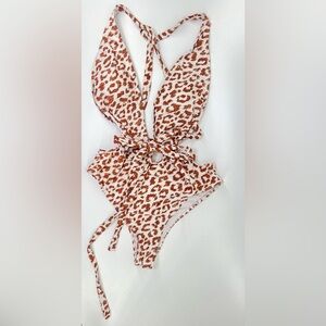 Leopard Animal Print Low Cut One Piece Monokini Swimsuit Tan White Size L Large