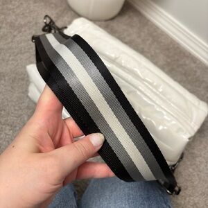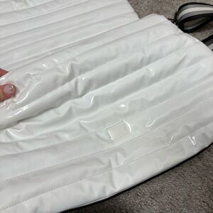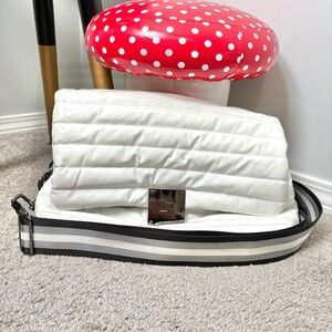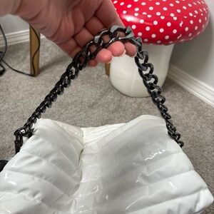 Chain top handle with optional striped strap that adjusts height can switch from either. Puffer white material. Snap pocket in the back. Inside has a zip pocket and tons of storage. Minimal useage and wear. Wear as shoulder or crossbody. Great condition!