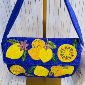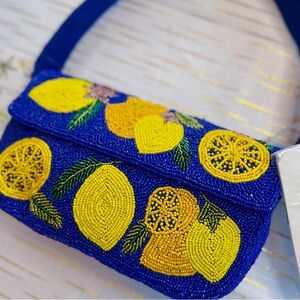 Features bold lemon beadwork on a vibrant blue base with a flap closure and fully lined interior with pocket. Lightweight yet eye-catching — a true statement set seen trending online.