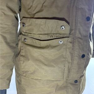 Embrace the cold with this stylish khaki puffer coat, featuring a cozy faux fur hood. Ideal for winter outings.