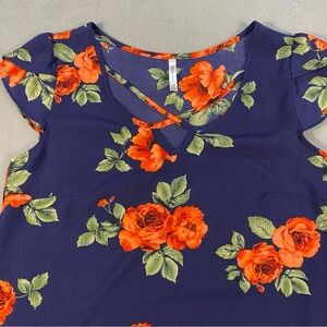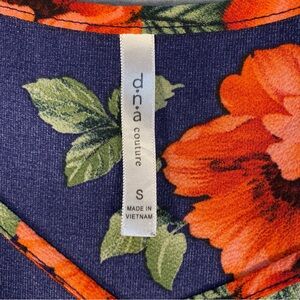 DNA Couture Women’s navy & orange Floral blouse, V-neck, cap sleeves, size S