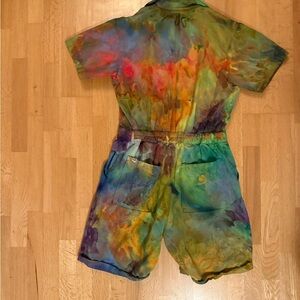 Hemmed to be a shorts jumpsuit, which are super rare and as far as I know were never made in fun bright colors. I bought it white and ice dyed it, I’m absolutely in love with it but it’s just too big on me. EUC but better than new because of the custom ice dyed. Totally one of a kind.