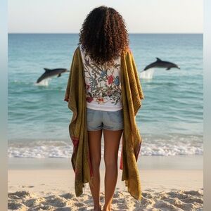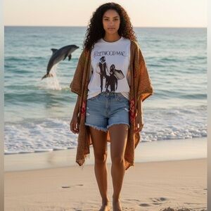 FLEETWOOD MAC BAND T with Kantha Sleeves, Poncho Style Handmade w pockets. Beautiful Floral/Bird scarf added to back. no 2 ever alike. One size fits most.
