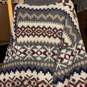 The product is a vintage Abercrombie & Fitch men's XL pullover sweater in a chunky knit style with a fair Isle pattern. Made from a blend of ramie and cotton, this green sweater features a crew neck and long sleeves, making it suitable for casual occasions in the winter, fall, and spring seasons. With a retro 90s theme, this sweater is machine washable and perfect for outdoor activities like walking. Its vintage design adds a unique touch to any wardrobe, offering a comfortable and stylish option for men looking for a classic and timeless sweater piece.