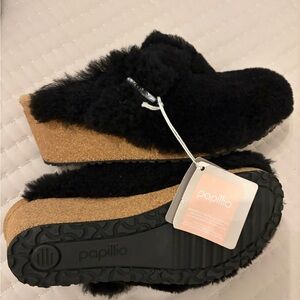 Papillio by Birkenstock Fanny Teddy wedge clog in black shearling size 9 US New