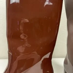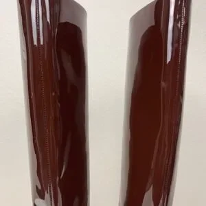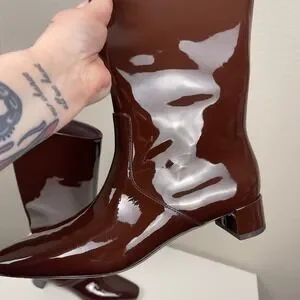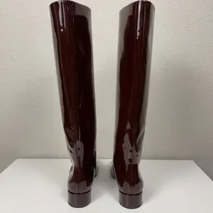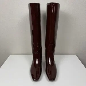 chocolate brown, patent leather, knee high, square toe, block heel, designer, chic, fall, winter, luxury, quiet luxury