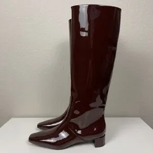 Loeffler Randall Indy knee-high boots crafted from glossy patent leather in a rich chocolate hue. These boots feature a square toe and a low block heel, approximately 1.25 inches, for comfortable wear. Designed as pull-on boots with a leather upper, they offer a sleek and sophisticated silhouette.