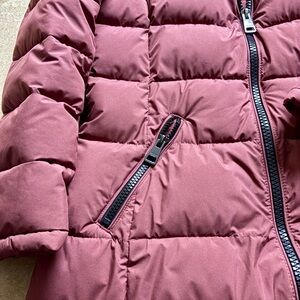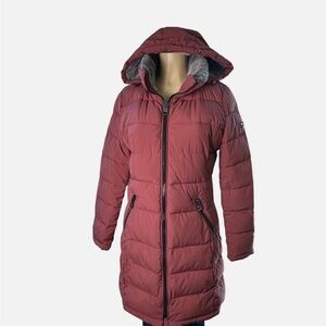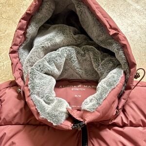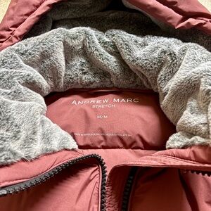 Elegant dark rose jacket by Andrew Marc. Features soft gray plush lining. Ideal for chilly days.