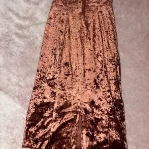 It is a beautiful crushed velvet, with cute cutout shoulder detail. It has a small slit in the back, and an invisible zipper. It is fully lined, and has a nice comfortable stretch. This is such a beautiful dress! You can wear it to any fancy occasion, work, or church and look amazing! Luxurious velvet maxi dress. Features a stylish slit. Perfect for elegant occasions. See 6th picture for minor detail of the stiching.