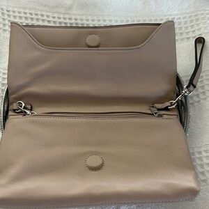 Chic taupe clutch with a sparkling rhinestone strap. Perfect for evening outings. Compact and stylish.