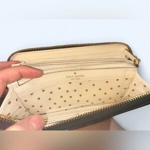Classic Kate Spade Spencer zip-around wallet in black saffiano leather with gold-tone hardware and signature polka-dot interior. Timeless, functional, and perfect for everyday use.