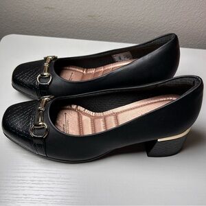 Step out in style and comfort with these Brazilian made elegant black block heel, horsebit buckle detail and a textured toe cap shoes. Perfect for any occasion, these shoes offer both comfort and sophistication.