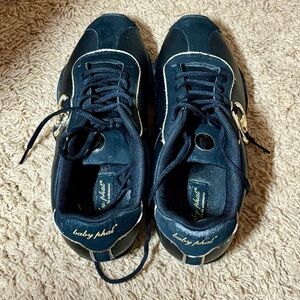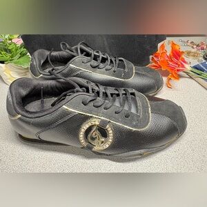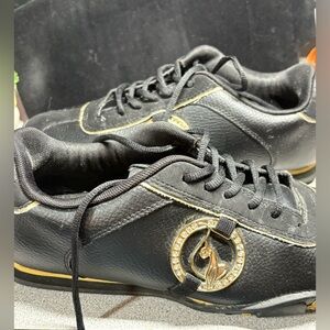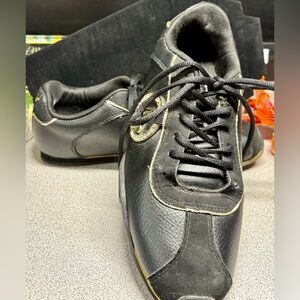 Step out in style with these sleek black leather women’s sneakers shoes, featuring a striking gold accent. Perfect for any occasion, these shoes offer both comfort and elegance. These are worn and the black is flaking a bit but still cute-a bit dusty but will restore well