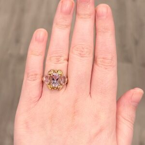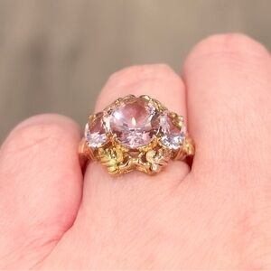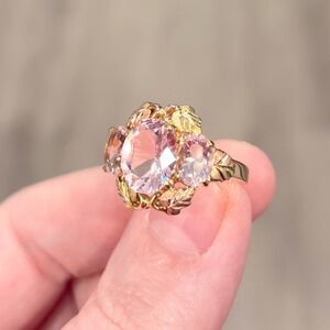 Stunningly gorgeous vintage Black Hills Gold pink ice three stone ring! Featuring oval cut pink Cubic Zirconia stones (a 10x8mm center, and two 7x5mm side stones), set in 10K solid yellow gold. The leaves are 12K solid rose and green gold.