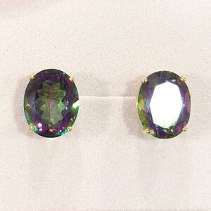 Beautiful colorful Clyde Duneier solitaire stud earrings! Featuring iridescent 10x8mm oval cut Mystic Topaz stones, set in 14K solid yellow gold.