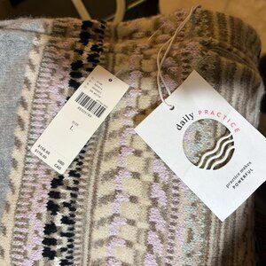 Anthropologie Daily Practice Turtleneck Sweater Midi Dress Removable Collar Fair Isle. Gray with tan, black, white and light pink fair isle stripe pattern at collar, sleeves, and hem. Turtleneck collar can be removed via buttons.
