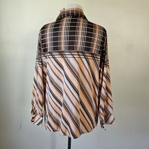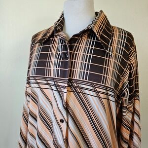 Vintage 70s Brown Peach Gray Stripe Plaid Polyester Disco Dagger Collar Shirt L