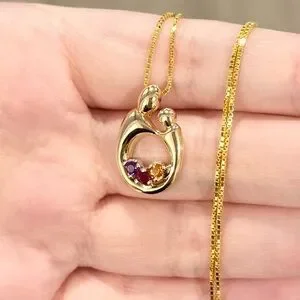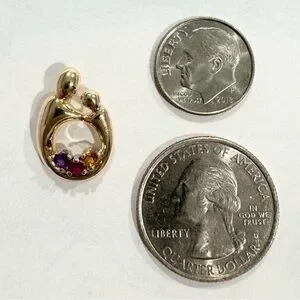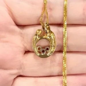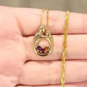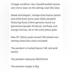 Sweet and elegant, vintage style Kaynar parent and child three stone open slider pendant! Featuring three 2.5mm genuine round cut gemstones (purple Amethyst, red Ruby, and orange Citrine), set in 14K solid yellow gold.