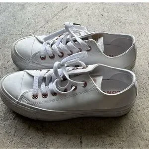 Stylish leather Converse sneakers. Crisp white canvas. Rose gold eyelets. Classic lace-up design.