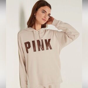 Beige hoodie and sweatpants set with bold pink logo. Comfortable and stylish