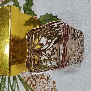 Elegant gold hand soap holder with a red bow design. Perfect for holiday decor. 4.5in. like new