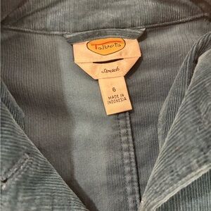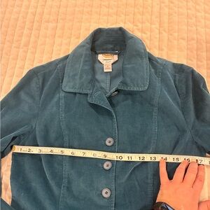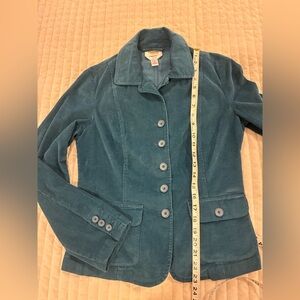 Very nice teal corduroy blazer by Talbots in a size 6. Stretch material as stated on tag. Color is most like the first two photos. Lighting changed appearance of color in other photos. Excellent condition.