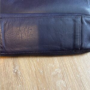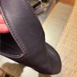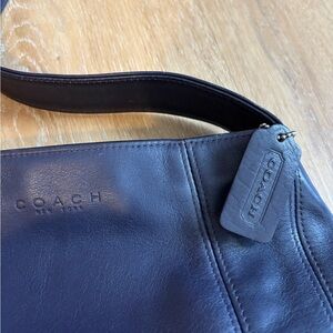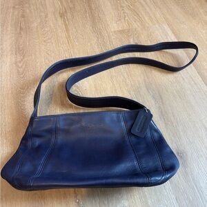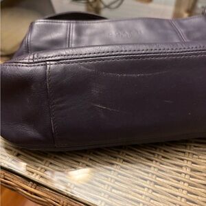 Stylish dark purple leather bag by Coach. Features a crossbody strap and minimalist design.
