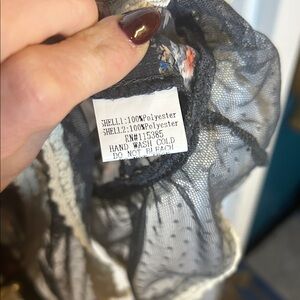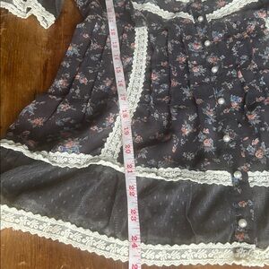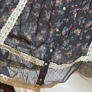 Sheer, floaty, and super romantic with the prettiest little floral print and delicate lace trim throughout. I wore this styled a few different ways — once tucked into high-waisted black jeans with boots, and once layered over a lace bralette with vintage Levi’s for that effortless thrifted-girl look.