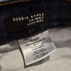 Chic dark blue high rise jeans. Features button fly and classic five-pocket style. Ideal for versatile wear.