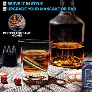 This deluxe set of of drinking accessories is perfect for giving your beverage of choice the star treatment it deserves. Our cowboy-themed set is complete with everything you need for a good glass of whiskey. The metal-cornered pinewood case and engraved glasses and ice bullets give it a more exclusive appeal that is sure to turn heads and start conversations.