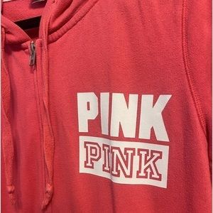 Excellent condition with very minor pilling Women’s Medium PINK Victoria’s Secret Zip Up Hoodie in Bright Pink with maybe a hint of orange but mostly pink. PINK Logo on Chest