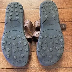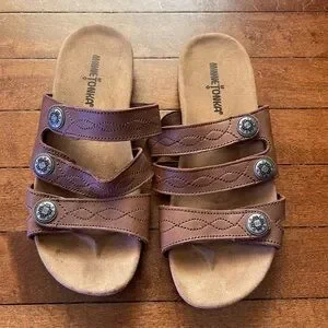 Minnetonka Women's Leather Brown Slip-on 3 Straps Sandal Suede Footbed Sz 7
