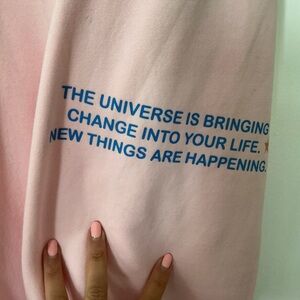 Stay cozy and stylish with these light pink BSR sweatpants in a women’s size medium. Featuring a soft fleece interior, elastic waistband, and ankle cuffs for a snug fit. Minimalist text design adds a trendy touch — one leg reads “THE UNIVERSE IS BRINGING CHANGE INTO YOUR LIFE” in blue. Gently worn and in excellent condition with no stains or holes.