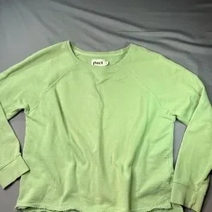Soft and cozy PACT organic cotton sweatshirt in a light green shade. Features a relaxed fit, raglan sleeves, and a raw hem for a casual, lived-in look. Made from organic cotton for comfort and sustainability.