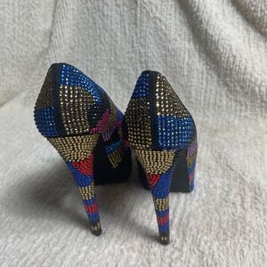 Steve Madden Dyvinal Rhinestones Multi Color slip on platform heels SZ8.5. Pre owned in good used condition signs of wear on the inner lining has some peelings. See all pictures.L5