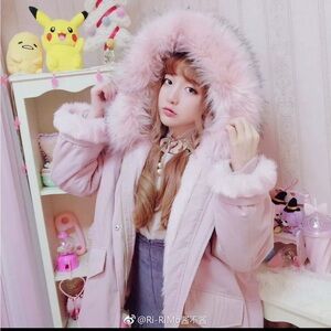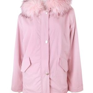 Stay warm and stylish with this chic pink jacket featuring a luxurious fur-trimmed hood. Perfect for adding a touch of elegance to your winter wardrobe.