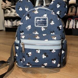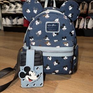 Charming Loungefly backpack and wallet with Mickey Mouse design. Denim blue color. Perfect for Disney fans.