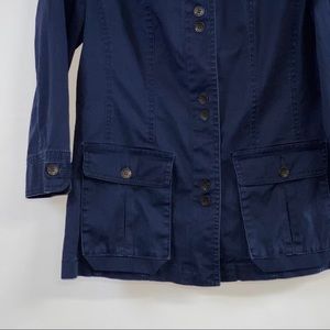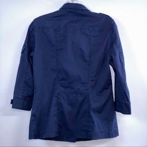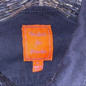Workers For Freedom Vintage Military Style Jacket. Size 6. Navy Blue. 2 fake pockets at the top front. Button up with 8 buttons. 2 pockets in the front. This is in Excellent Condition. Size 6. Chest is 17 inches armpit to armpit. Length is 15 inches armpit to bottom.