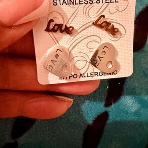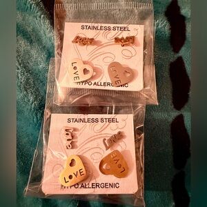 Hypoallergenic stainless steel earrings with Heart and 'Love' design. Includes silver and gold tones.