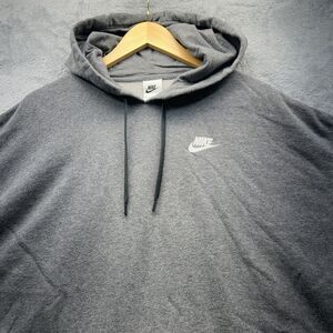 Style: Womens pullover hoodie sweatshirt in solid heathered gray with small white Nike swoosh logo at the left chest.