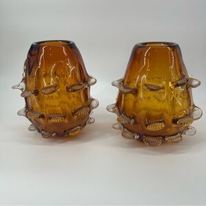 Vintage MCM Set of 2 Amber Glass Vases with Textured Design 7” Tall Heavy